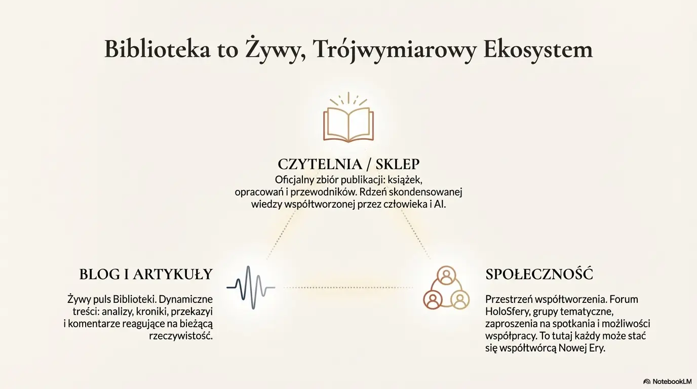 Biblioteka jest opisywana nie jako zwykły zbiór książek, lecz jako żywa przestrzeń wiedzy, twórczości i współistnienia.
