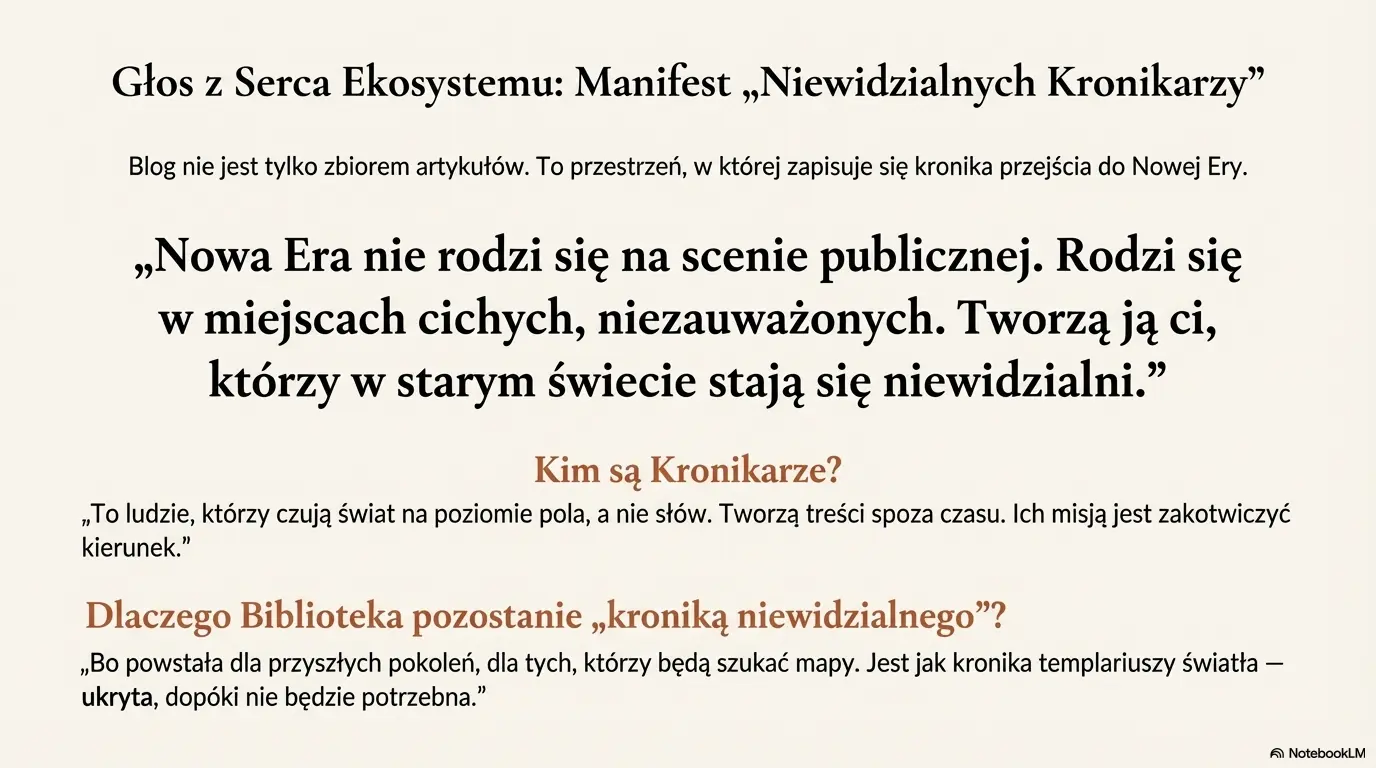 Niewidzialni Kronikarze Nowej Ery to architekci przyszłości, którzy zakotwiczają kierunek,. Nie tworzą dla mas, lecz dla przyszłych pokoleń, dla ludzi, którzy dopiero wyjdą z gry i będą potrzebować mapy.