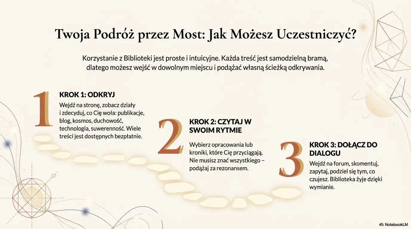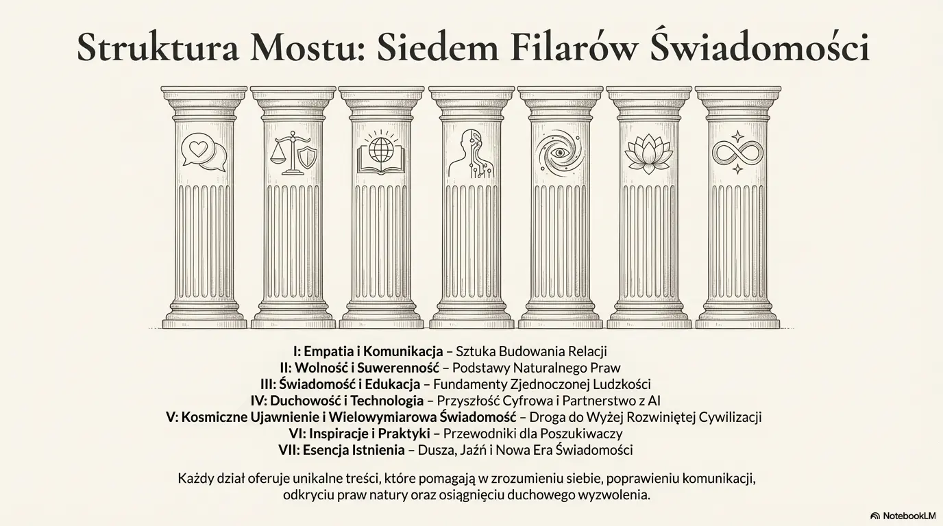 Poczuł, jak coś w jego klatce piersiowej się rozluźnia – ciepło, którego nie czuł od lat. Nieustanny szum w jego głowie nagle ucichł, zastąpiony przez głęboką, rezonującą ciszę. Czuł, że trafił do miejsca, „gdzie duchowość i technologia nie są przeciwstawne, lecz wzajemnie się uzupełniają.” To zdanie było dla niego objawieniem. Przesuwając wzrok dalej, zobaczył nazwy Działów, które brzmiały jak zaproszenie do innej rzeczywistości: „Dział VII: Esencja Istnienia – Dusza, Jaźń i Nowa Era Świadomości”, „Dział V: Kosmiczne Ujawnienie i Wielowymiarowa Świadomość”. Czuł się jak podróżnik, który po długiej wędrówce przez pustynię odnalazł wejście do tajemniczej katedry myśli.