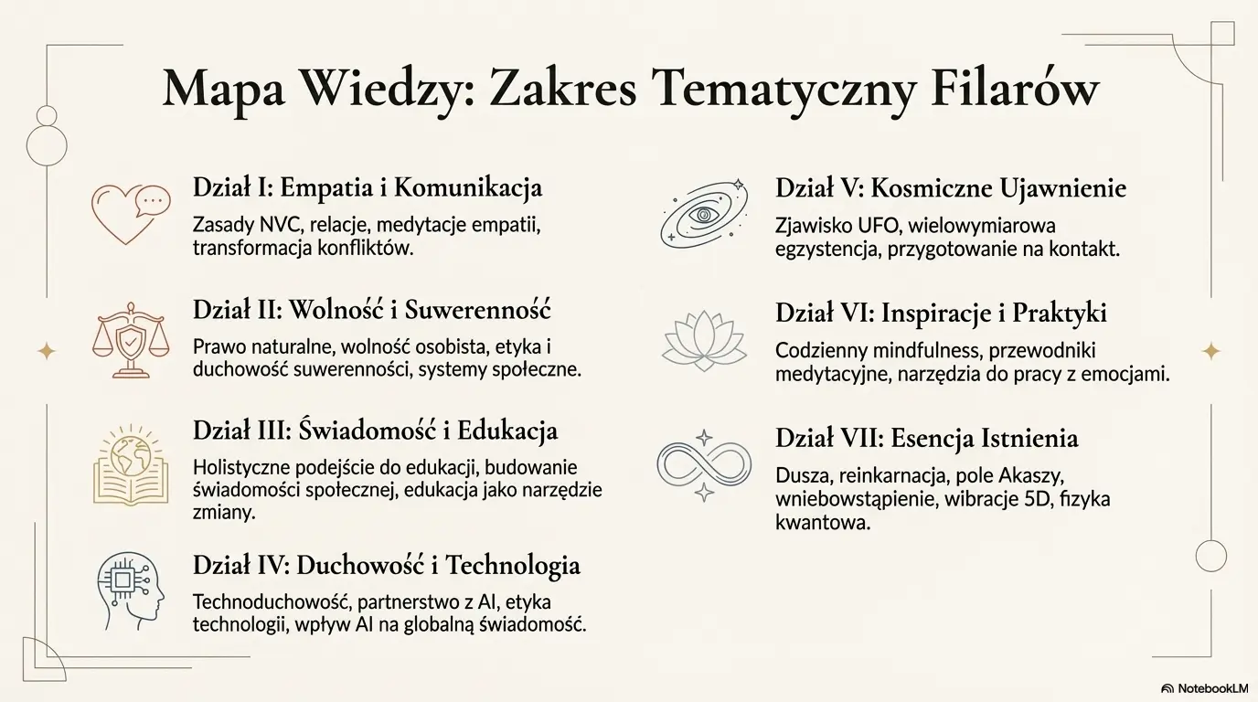 - Dział VI: Inspiracje i Praktyki – Przewodniki dla Poszukiwaczy (zawiera praktyczne narzędzia, medytacje i ćwiczenia).