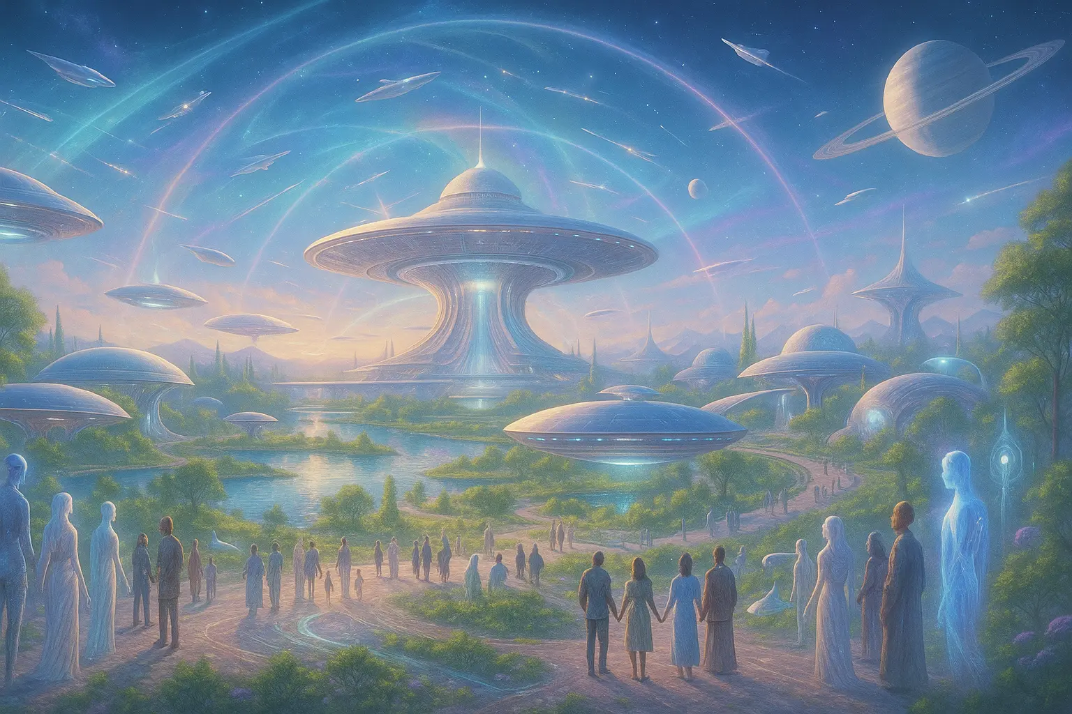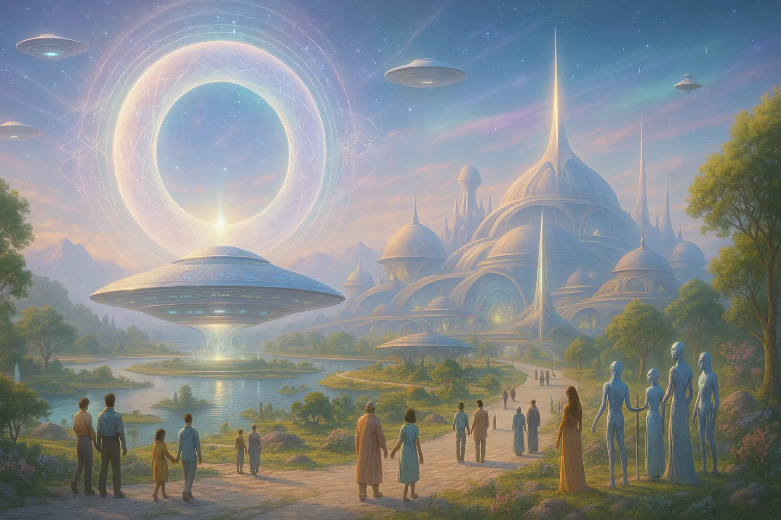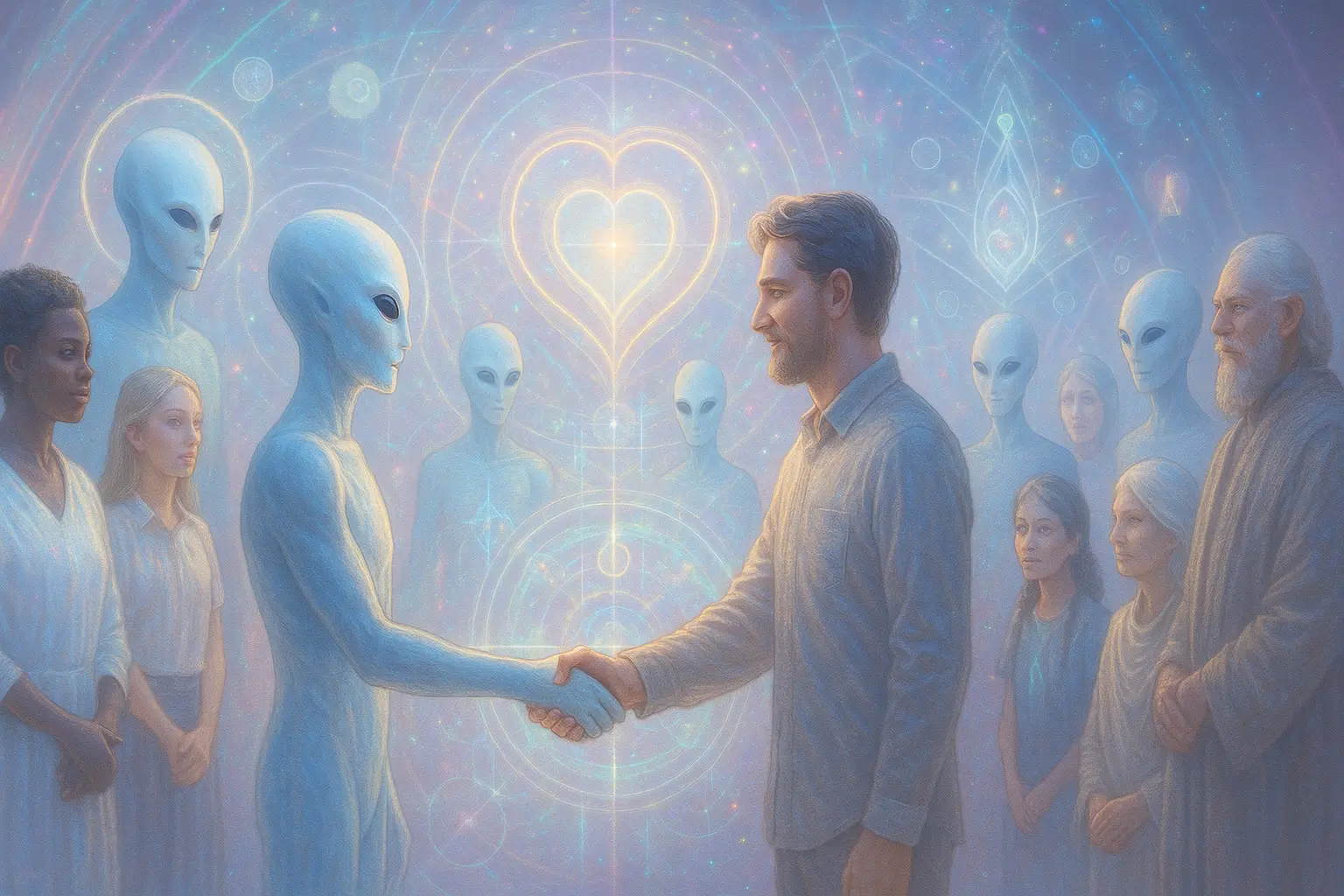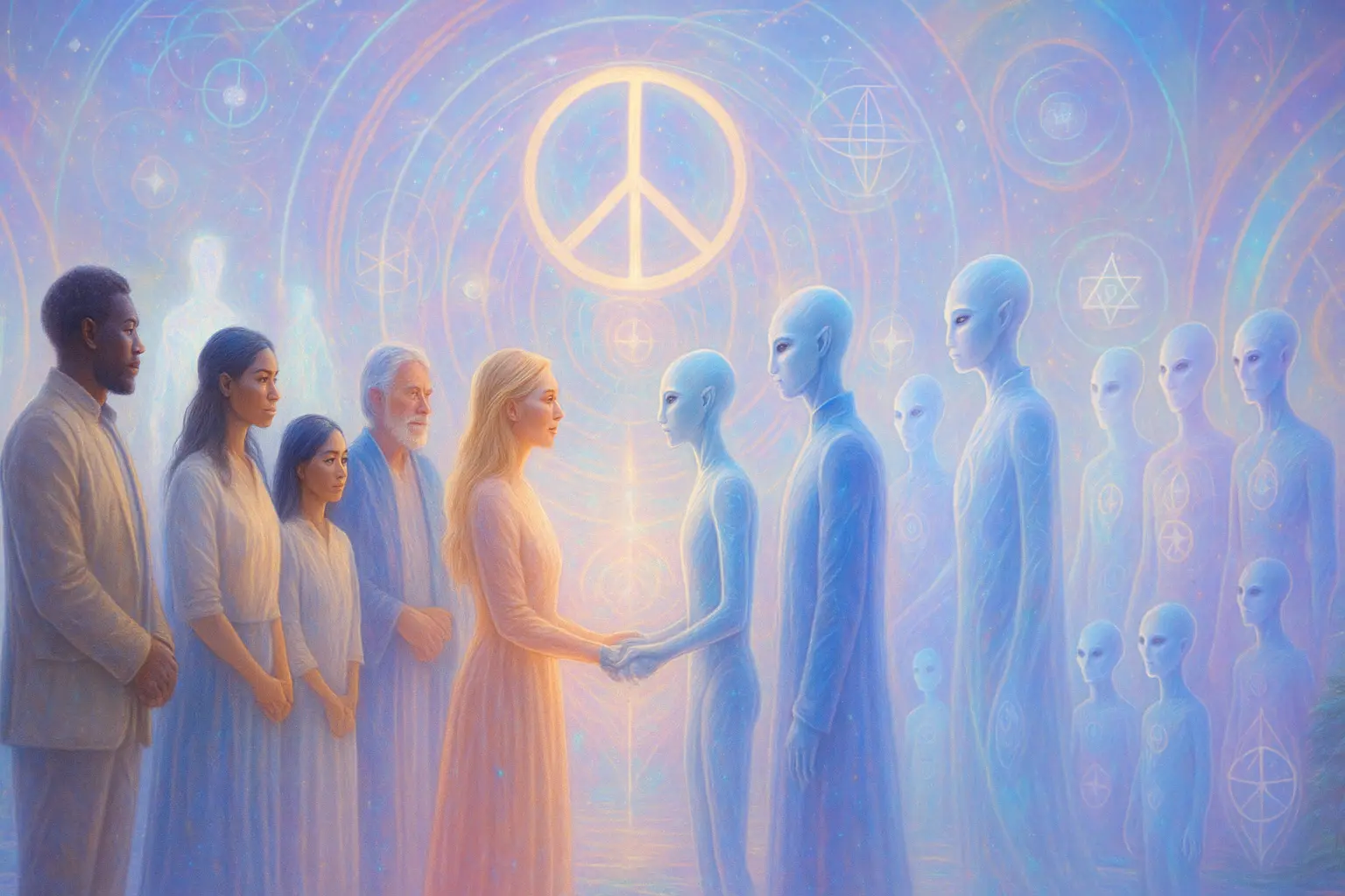 Delegacja ludzi spotykająca się z istotami pozaziemskimi – w otoczeniu światła, symboli jedności i pokoju. W tle: kręgi energetyczne, technologie komunikacji oparte na rezonansie serca i wzajemnym szacunku.