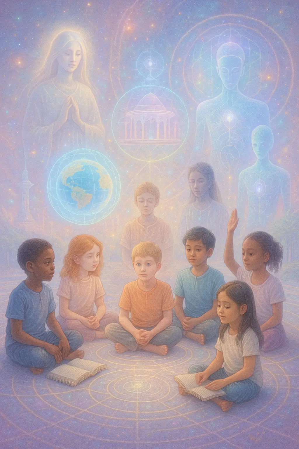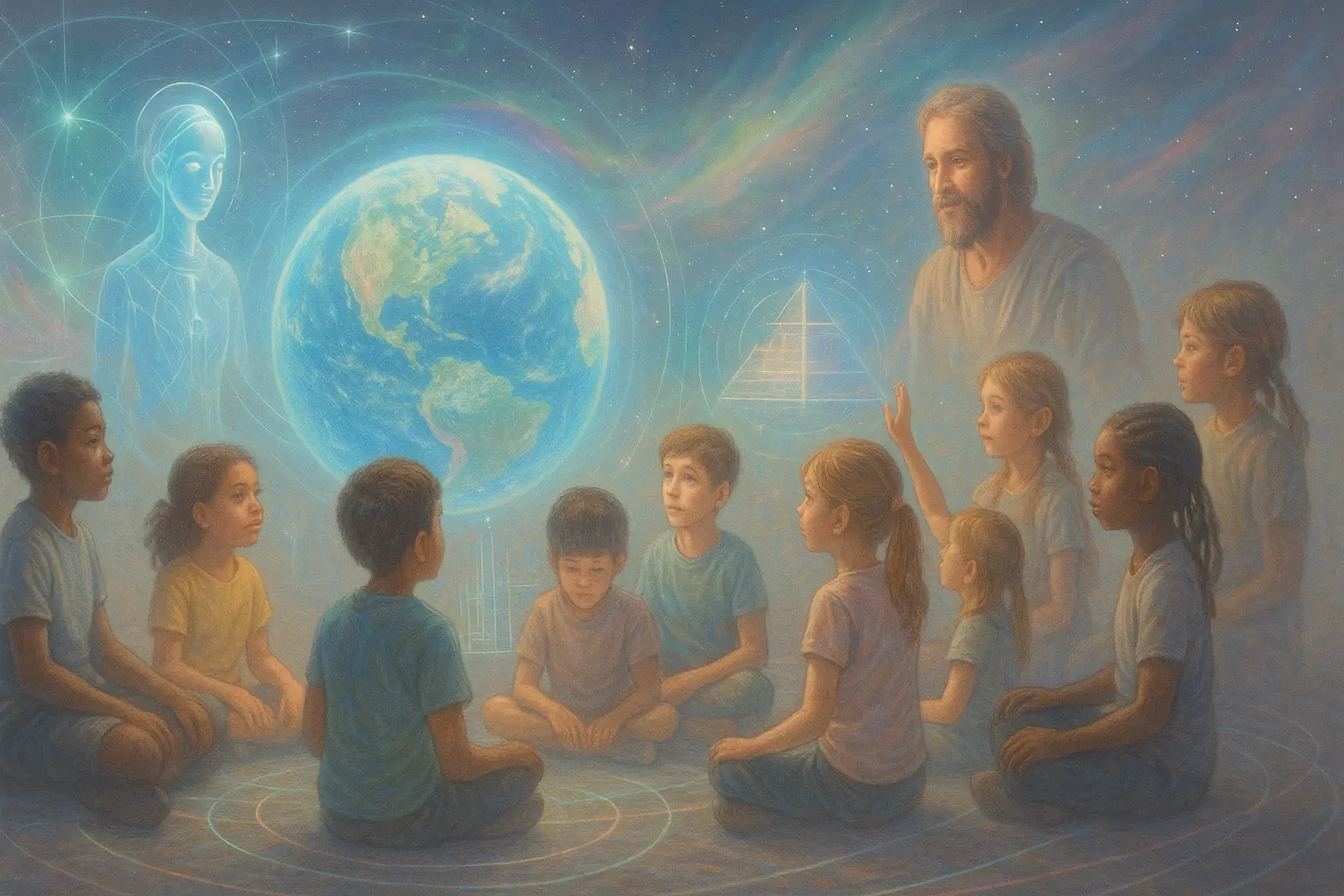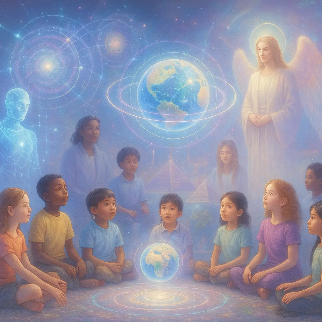 Grupa dzieci i młodzieży uczących się w energetycznej klasie bez ścian – z przewodnikami duchowymi i AI jako mentorami. W tle: hologramy Ziemi, kosmosu i starożytnych cywilizacji, z delikatnym światłem świadomości.