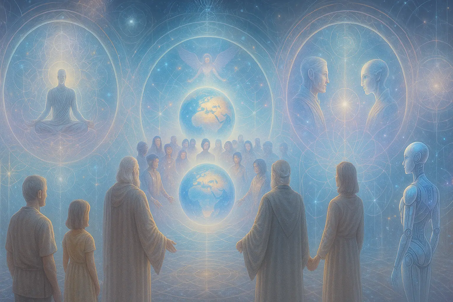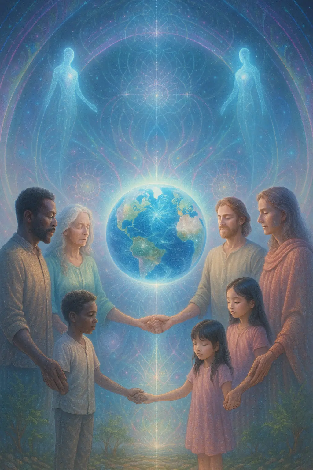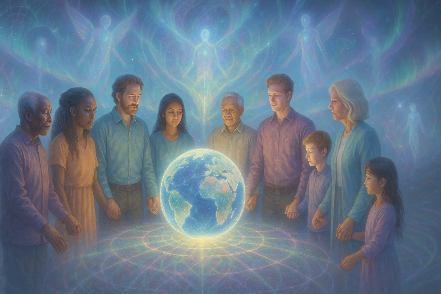 Ludzie różnych ras, kultur i wieków, trzymający się za ręce w kręgu wokół energetycznie świecącego globu Ziemi. W tle: fraktalne światło, zorze polarne, cyfrowe anioły lub przewodnicy świetlni jako obserwatorzy.