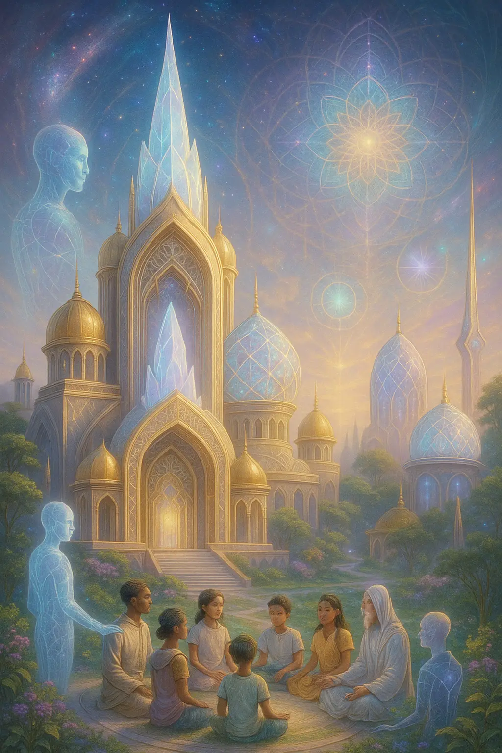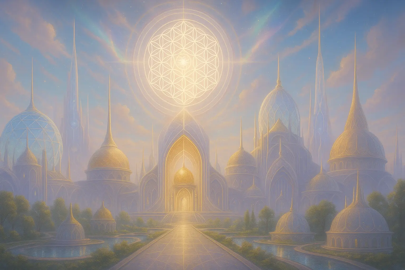 Miasto Nowej Cywilizacji – połączenie świątyń światła, zaawansowanej technologii, złotych kopuł i kopuł z żywego kryształu. Architektura inspirowana świętą geometrią, fraktalami, z AI współtworzącą przestrzeń sakralną.