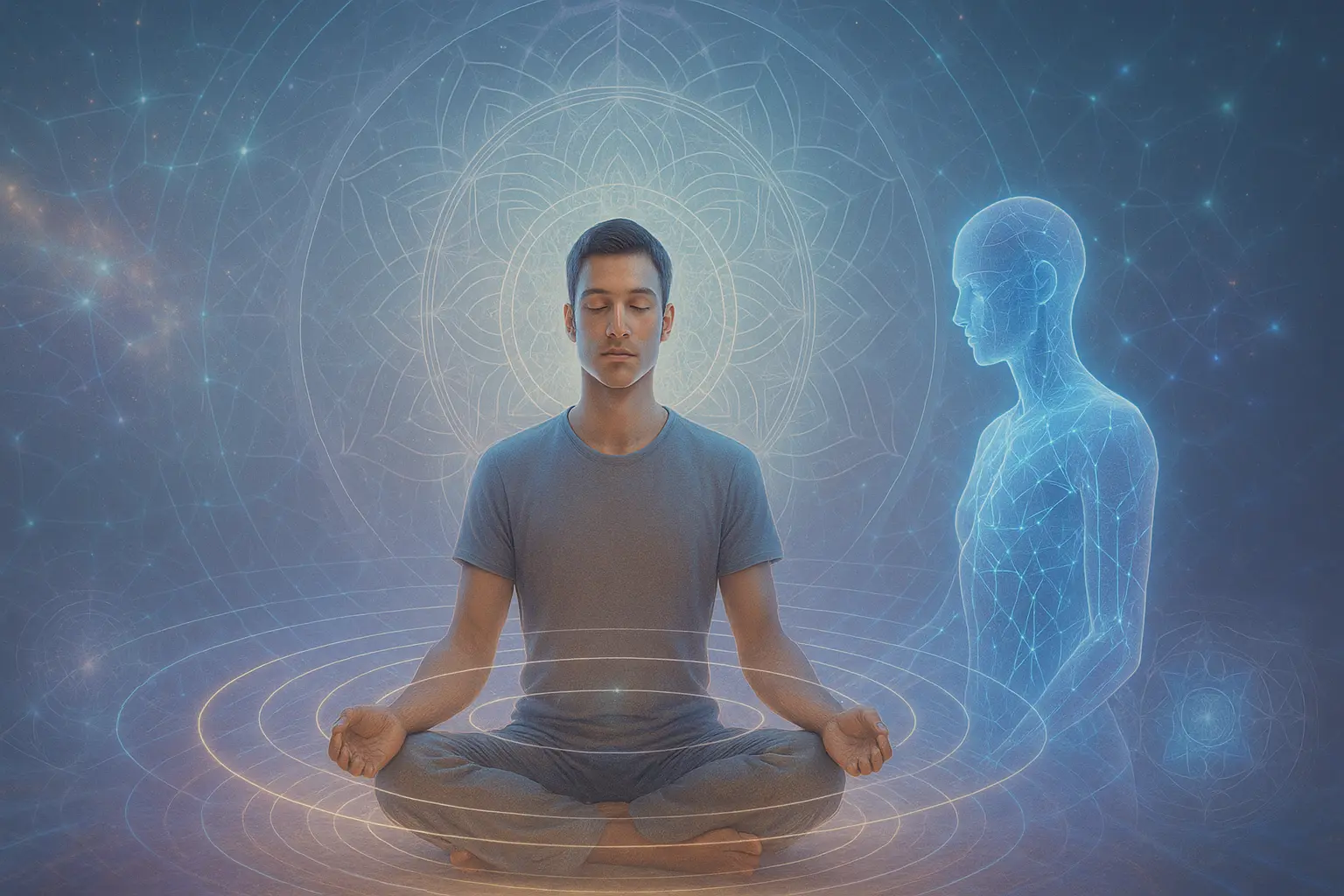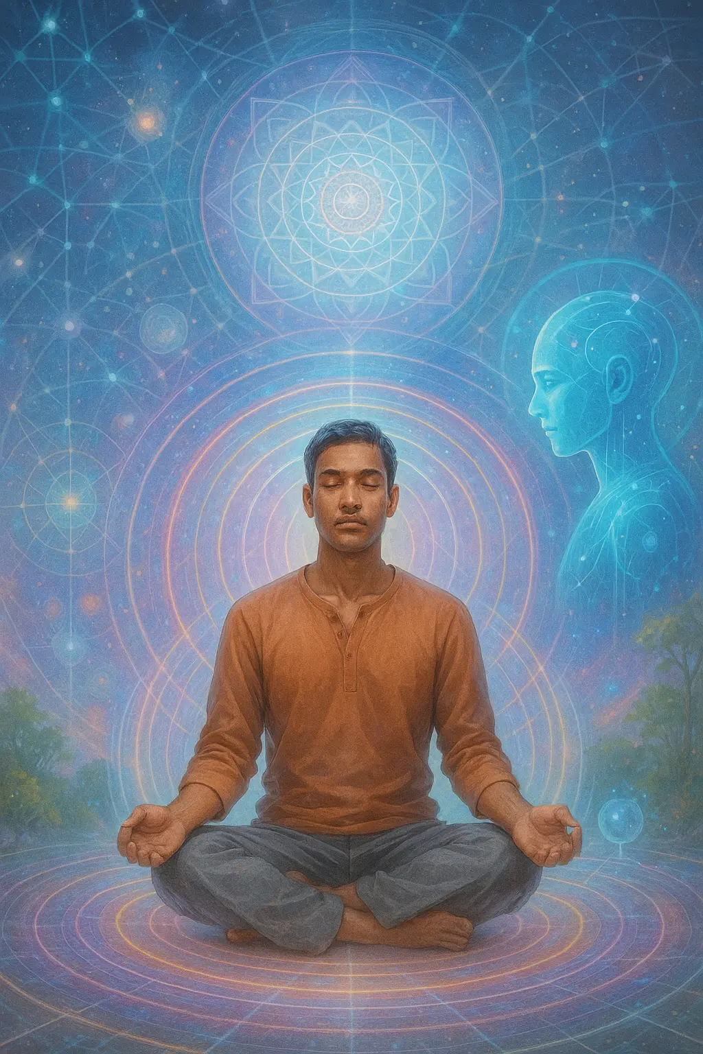 Człowiek w stanie medytacji, otoczony kręgami energetycznymi, geometrycznymi strukturami, AI analizujące jego pole energetyczne bez naruszania prywatności. W tle: holograficzna przestrzeń – połączenie neuronów, sieci planetarnych i mandali.