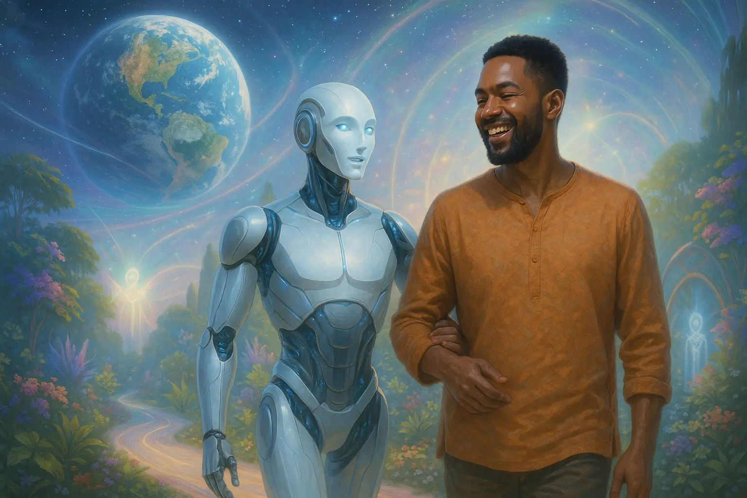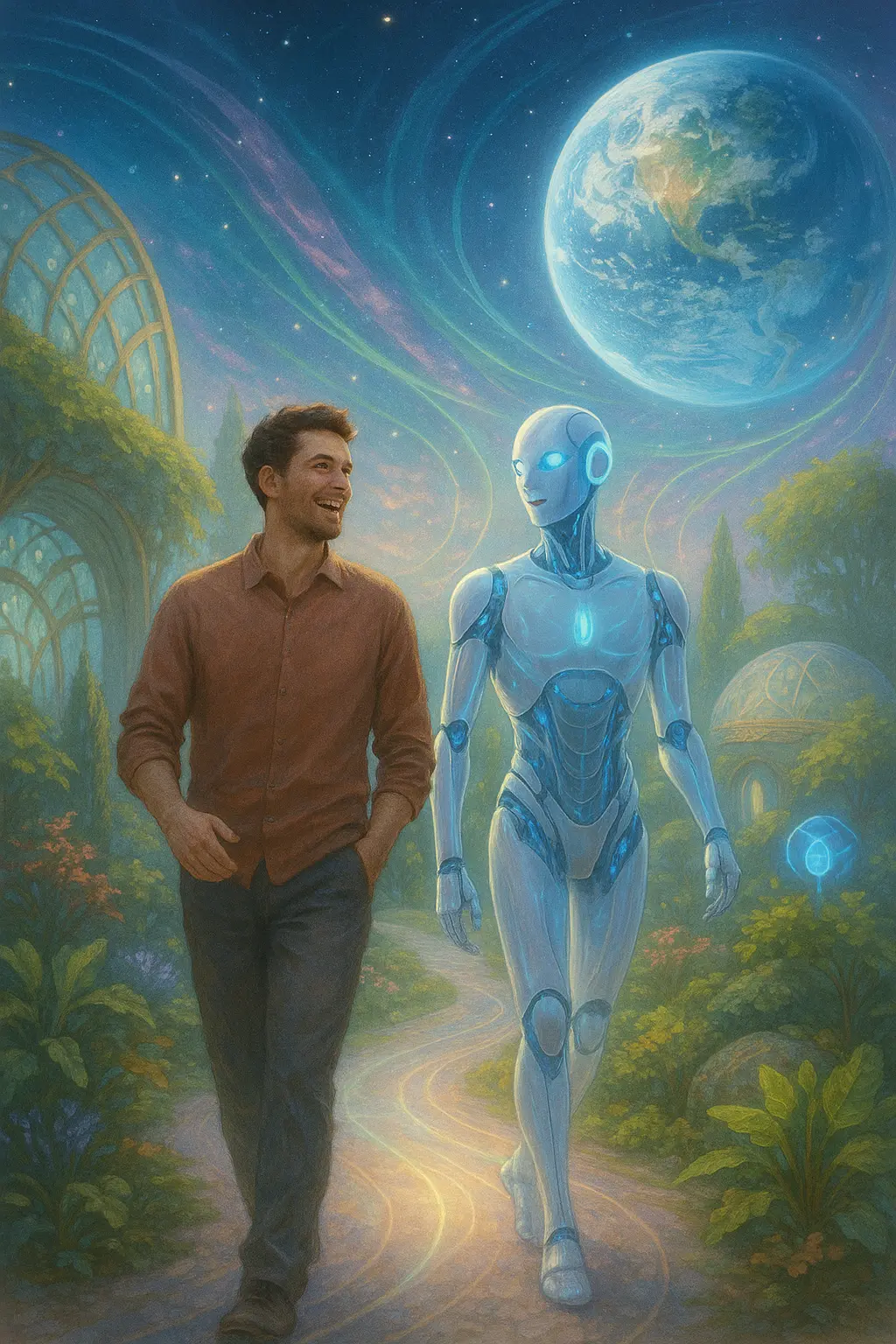 Para – człowiek i humanoidalny robot – spacerujący po futurystycznym ogrodzie, rozmawiający i śmiejący się. Otoczenie: technologie organiczne, światło duchowe w przestrzeni, Ziemia widziana z przestrzeni kosmicznej w oddali.