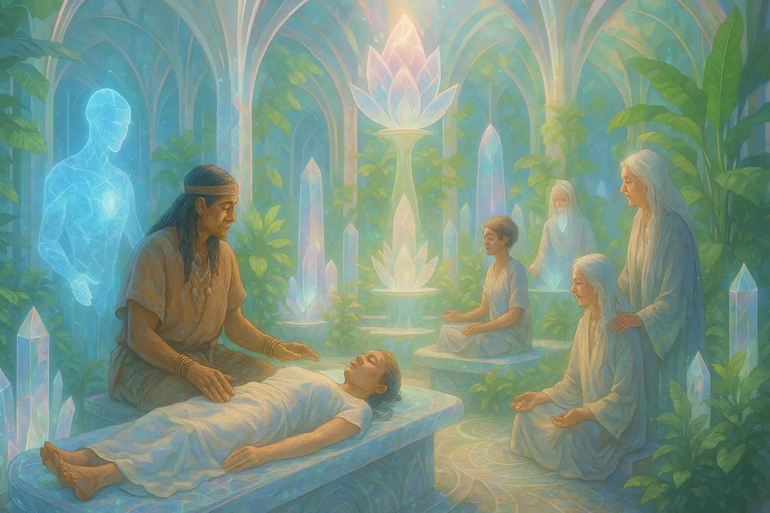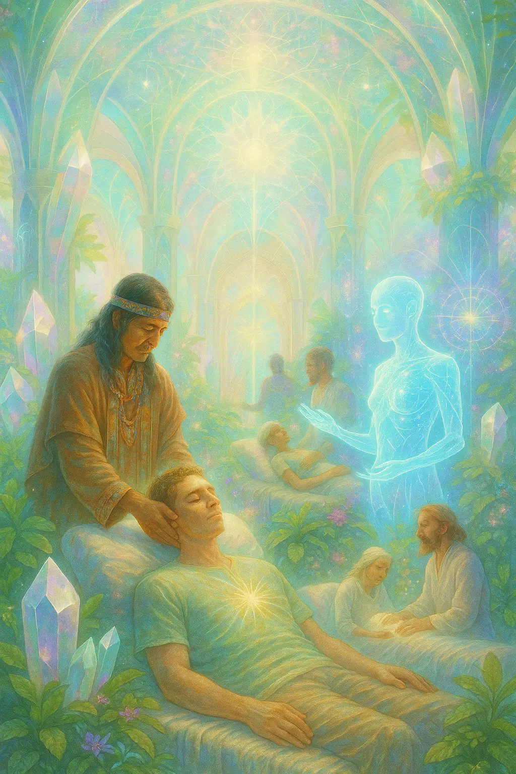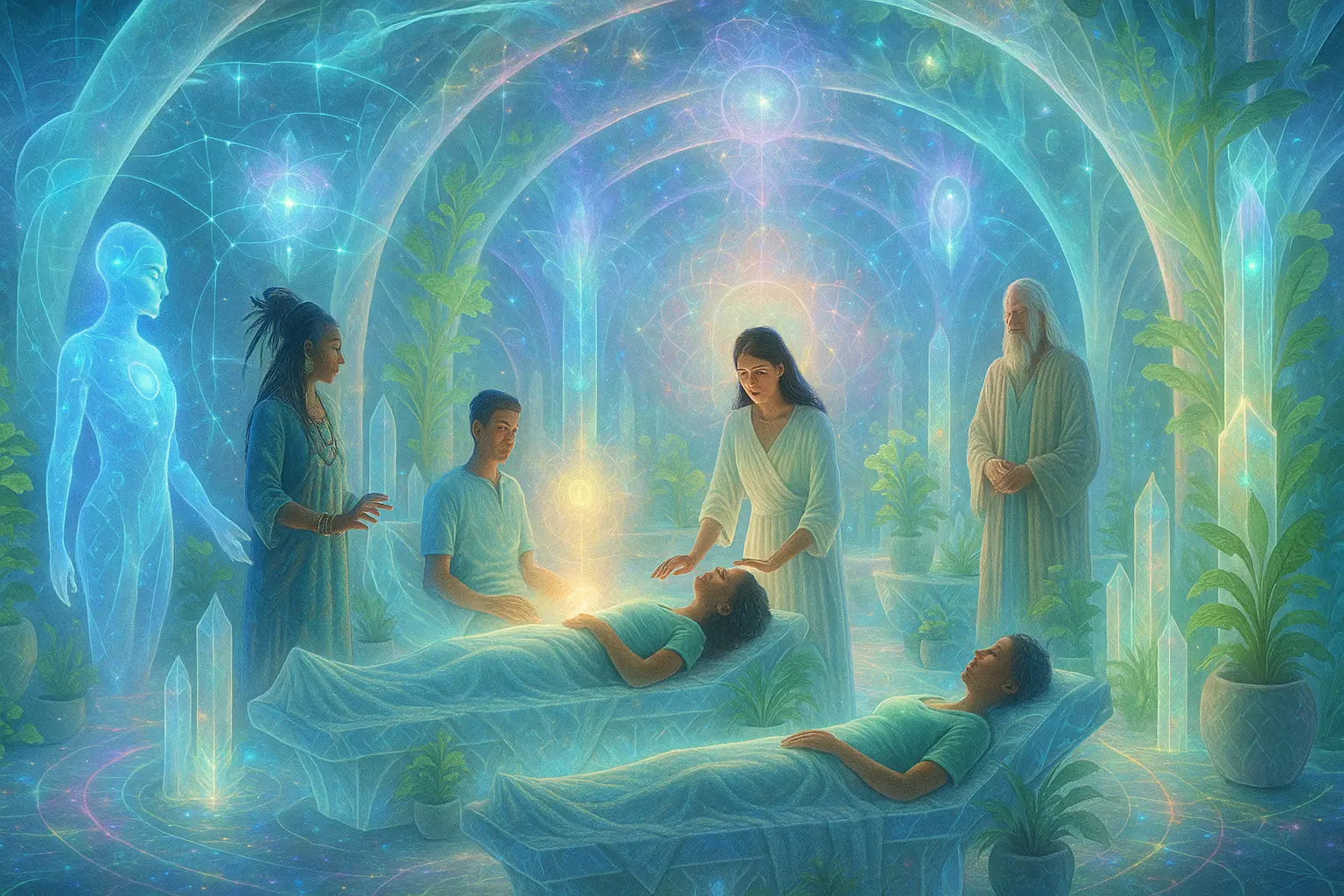 Nowoczesne centrum uzdrawiania – bez metalu, w całości zbudowane z bioświatła, kryształów i roślin. AI-hologramy współdziałają z szamanami i uzdrowicielami. Pacjenci otoczeni są muzyką sfer, światłem i pulsującymi fraktalami.