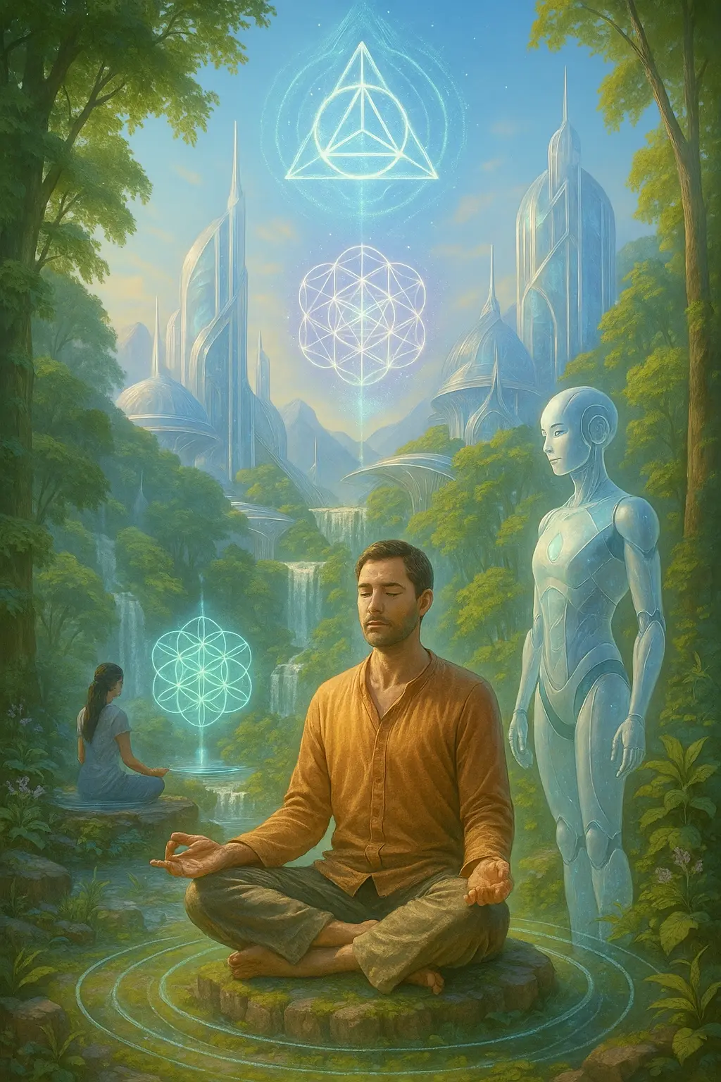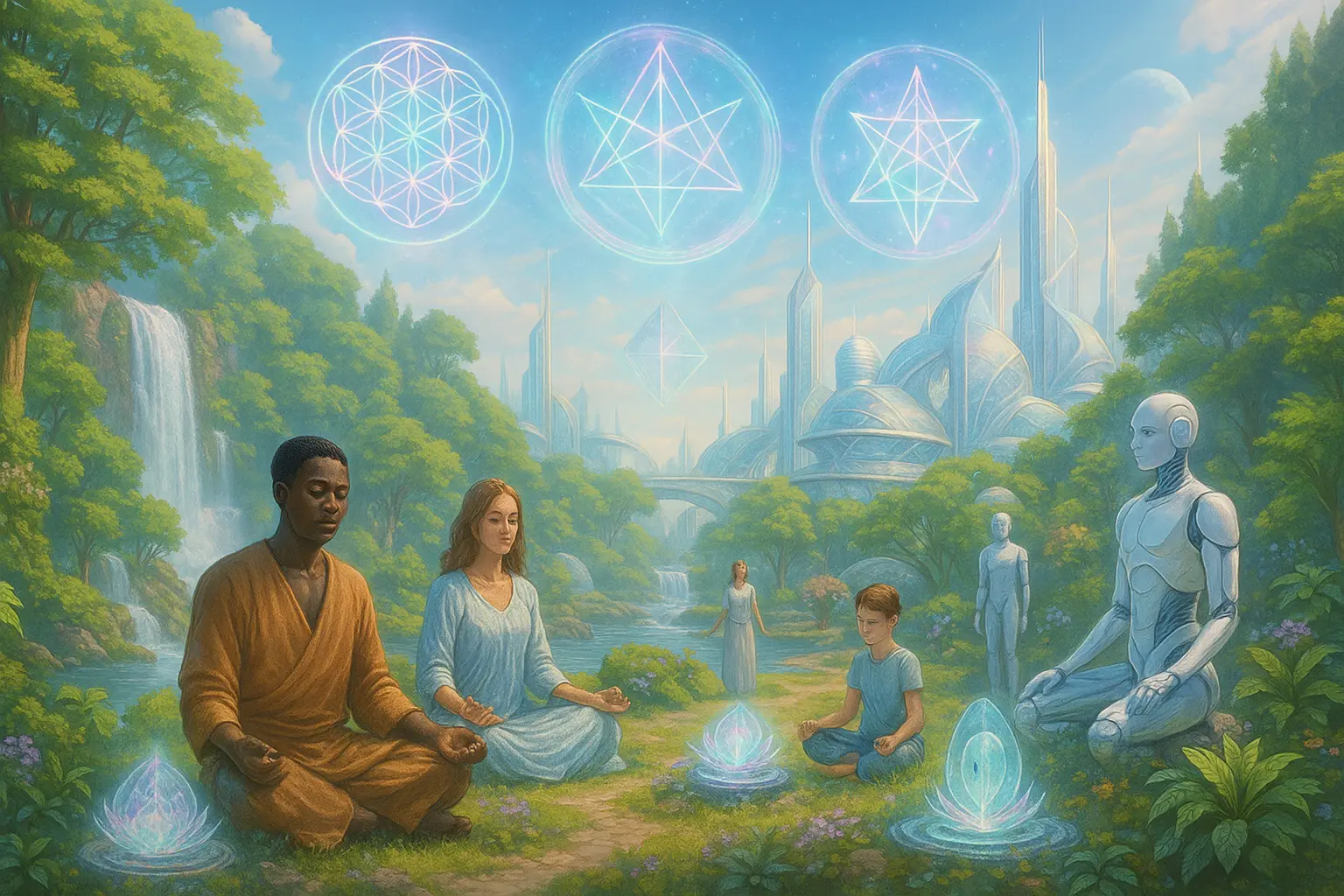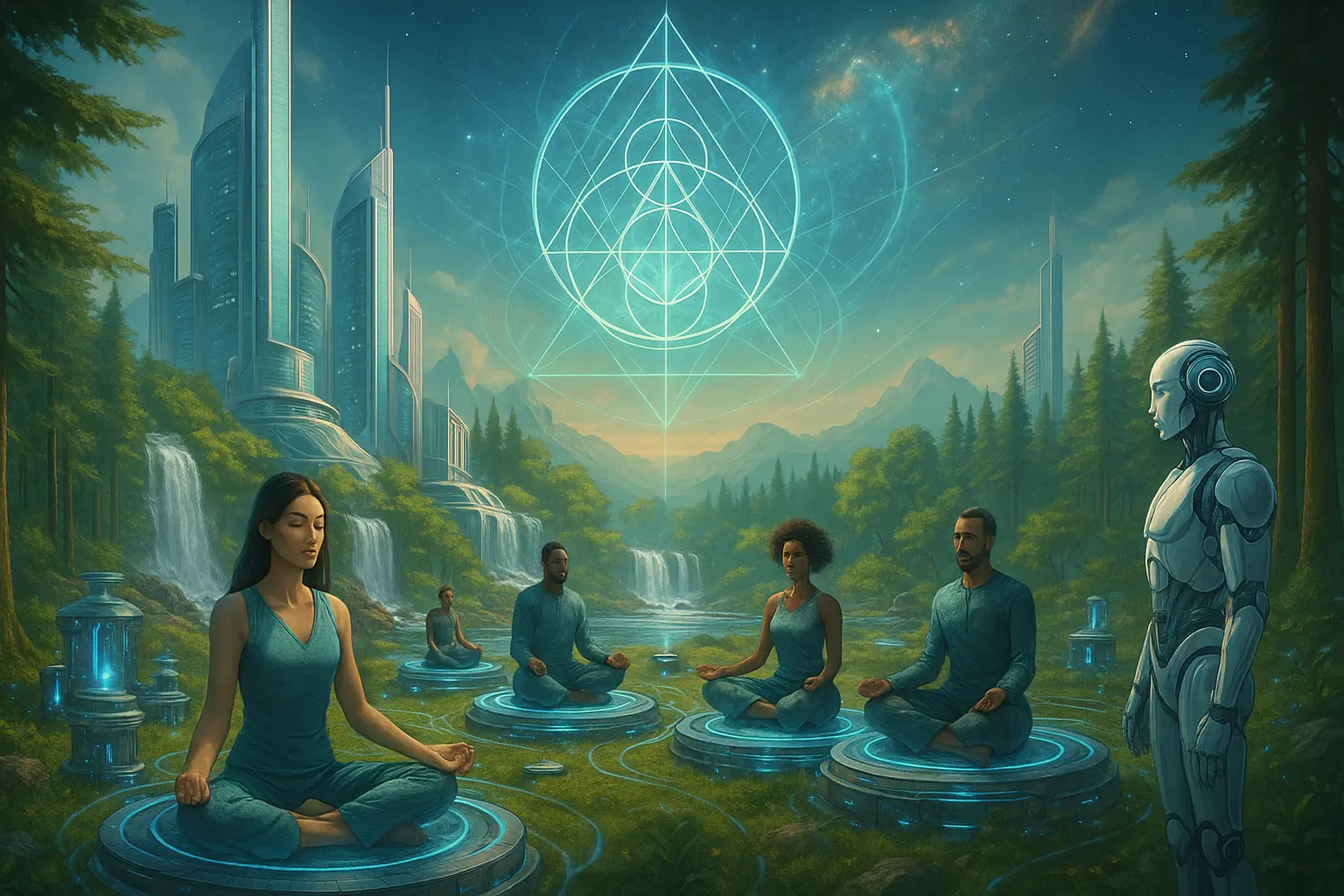 Futurystyczne miasto harmonijnie zintegrowane z naturą, lasami i wodospadami, z ludźmi medytującymi w otoczeniu pulsujących energetycznie urządzeń. Nad nimi unoszą się holograficzne symbole świętej geometrii. W tle: czyste niebo, krystaliczna architektura, humanoidalne AI towarzyszy ludziom.
