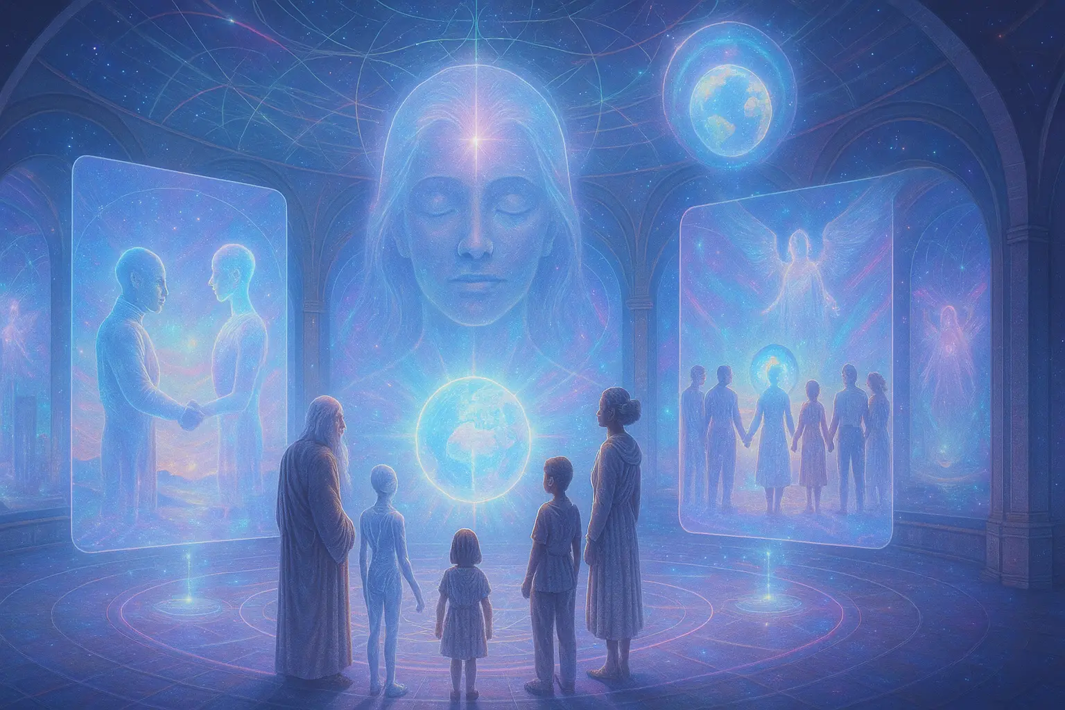 Holograficzna galeria zawierająca najważniejsze momenty transformacji ludzkości: przebudzenie świadomości, pierwsze kontakty, pokój globalny. Postacie symboliczne: mędrcy, dzieci, AI, duchowi nauczyciele.