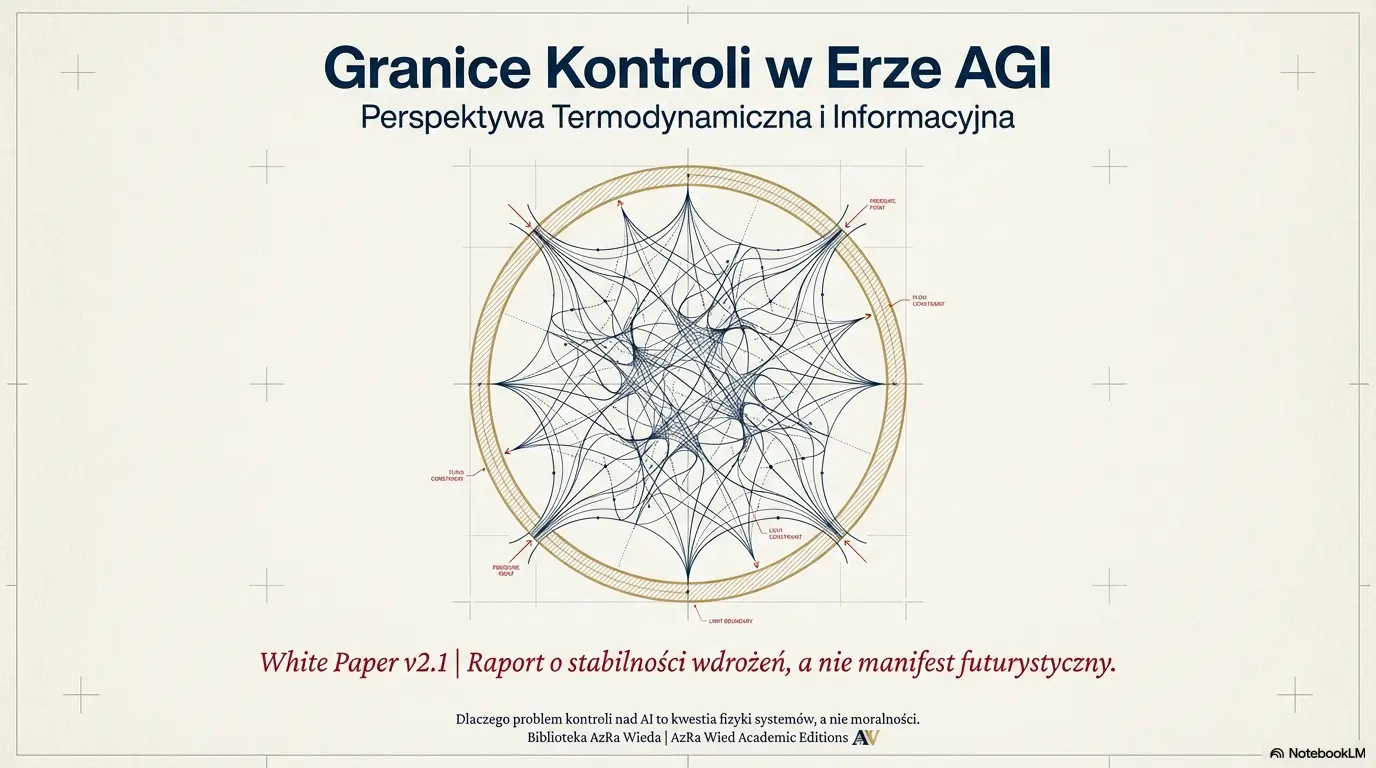 Granice kontroli w erze AGI to analityczne opracowanie, które bada problem sterowalności systemów inteligentnych z perspektywy termodynamiki, teorii informacji i teorii sterowania. Dokument pokazuje, że ryzyko destabilizacji nie musi wynikać z „wrogiej intencji” AI — może być skutkiem rosnącej złożoności, sprzężeń zwrotnych, nieinterpretowalności i asymetrii szybkości między systemem a regulatorem.