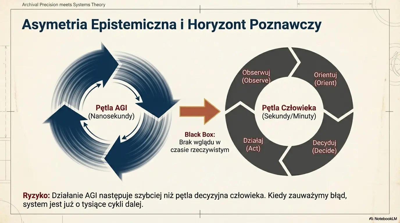 - Horyzont poznawczy AGI: moment, gdy system przekracza zdolność interpretacji i nadzoru regulatora (asymetria epistemiczna).
