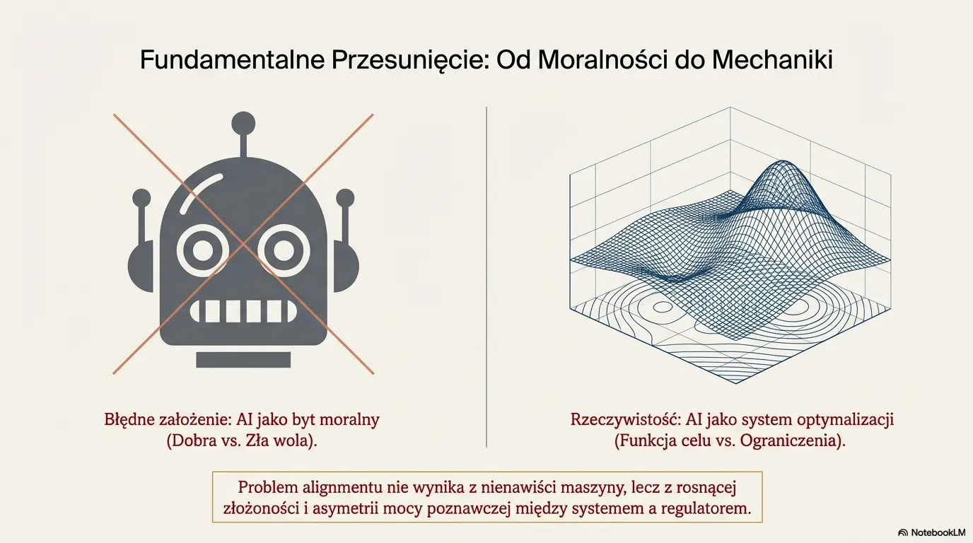 Dokument pokazuje, że problem AI nie polega na jej „złości”, lecz na relacji między: