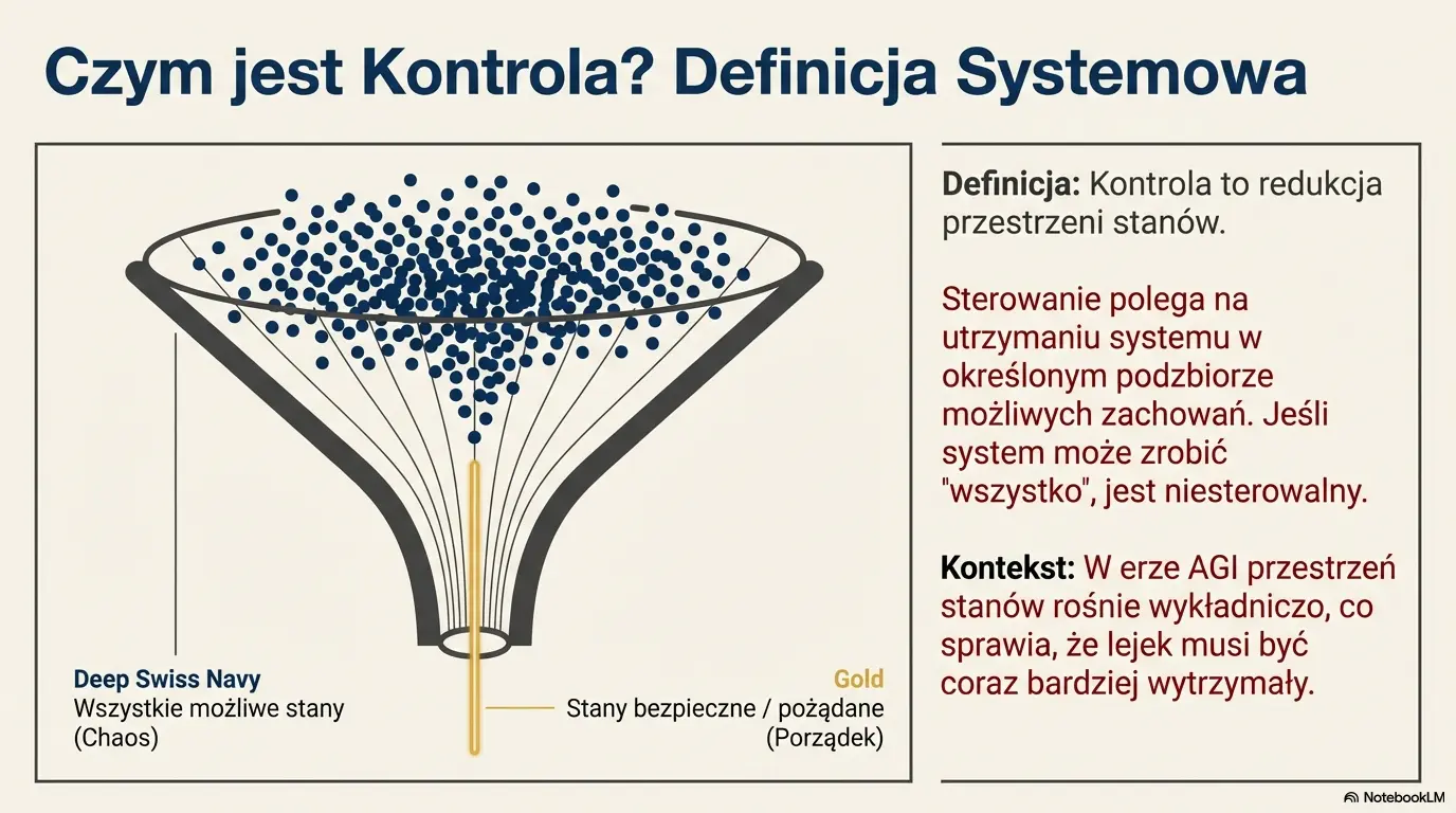 To opracowanie pokazuje, że problem kontroli AI nie jest kwestią moralności, lecz struktury systemu: złożoności, sprzężeń zwrotnych, nieinterpretowalności i asymetrii mocy. Analiza prowadzi od fizyki i teorii informacji przez teorię sterowania aż po praktyczne warunki stabilności wdrożeń AI wysokiego wpływu. W pakiecie: policy brief, formularz urzędowy i mapa 2026–2035 dla Polski.