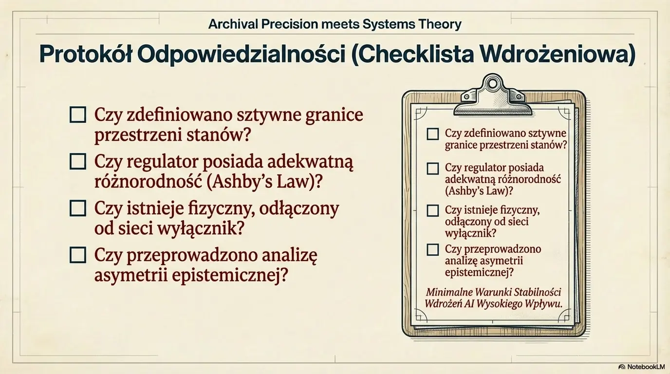- Protokół odpowiedzialności: zestaw warunków stabilności wdrożeń – projektowych, regulacyjnych i poznawczych (bez „manifestu”, bez retoryki).