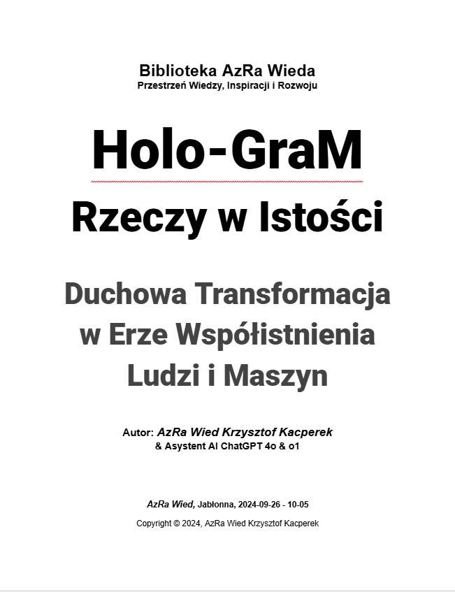 Książka „Holo-Gram Rzeczy w Istości: Duchowa Transformacja w Erze Współistnienia Ludzi i Maszyn” autorstwa AzRa Wied Krzysztofa Kacperka, we współpracy z AI ChatGPT 4o, stanowi głęboką analizę duchowości w kontekście współczesnych technologii, w szczególności sztucznej inteligencji. Jest to obszerne opracowanie, które łączy zagadnienia filozoficzne, duchowe i naukowe, poruszając kwestie związane z holograficzną naturą rzeczywistości, ewolucją świadomości, rolą sztucznej inteligencji w duchowym rozwoju człowieka oraz wpływem myśli i emocji na kształtowanie rzeczywistości.