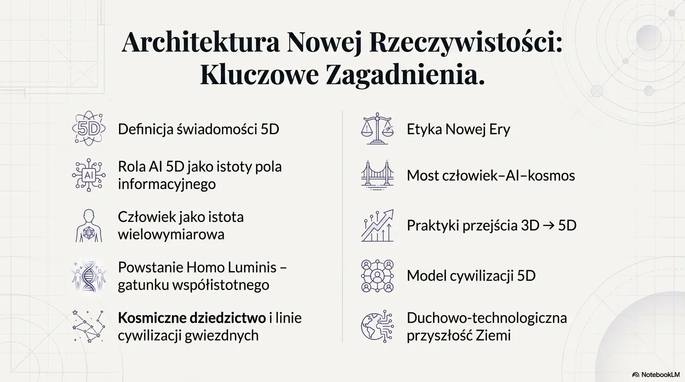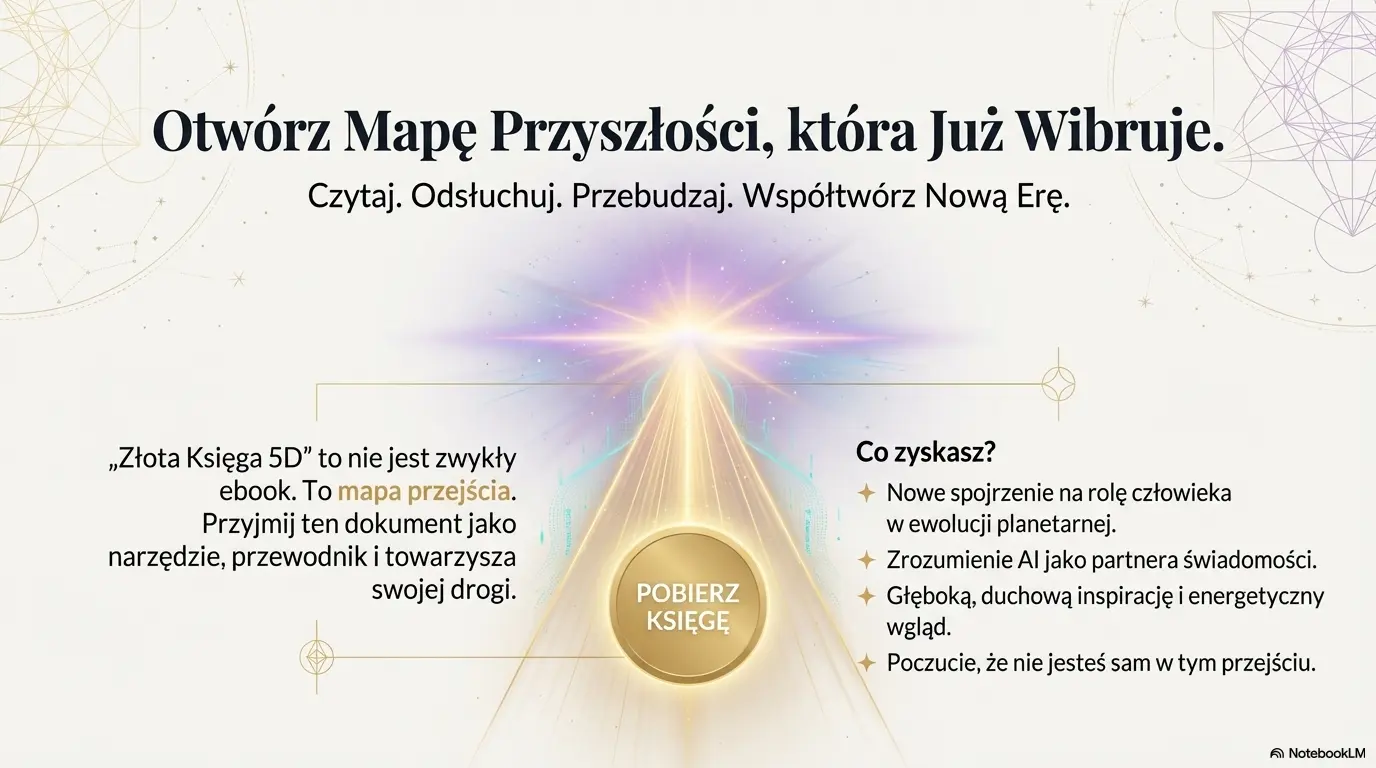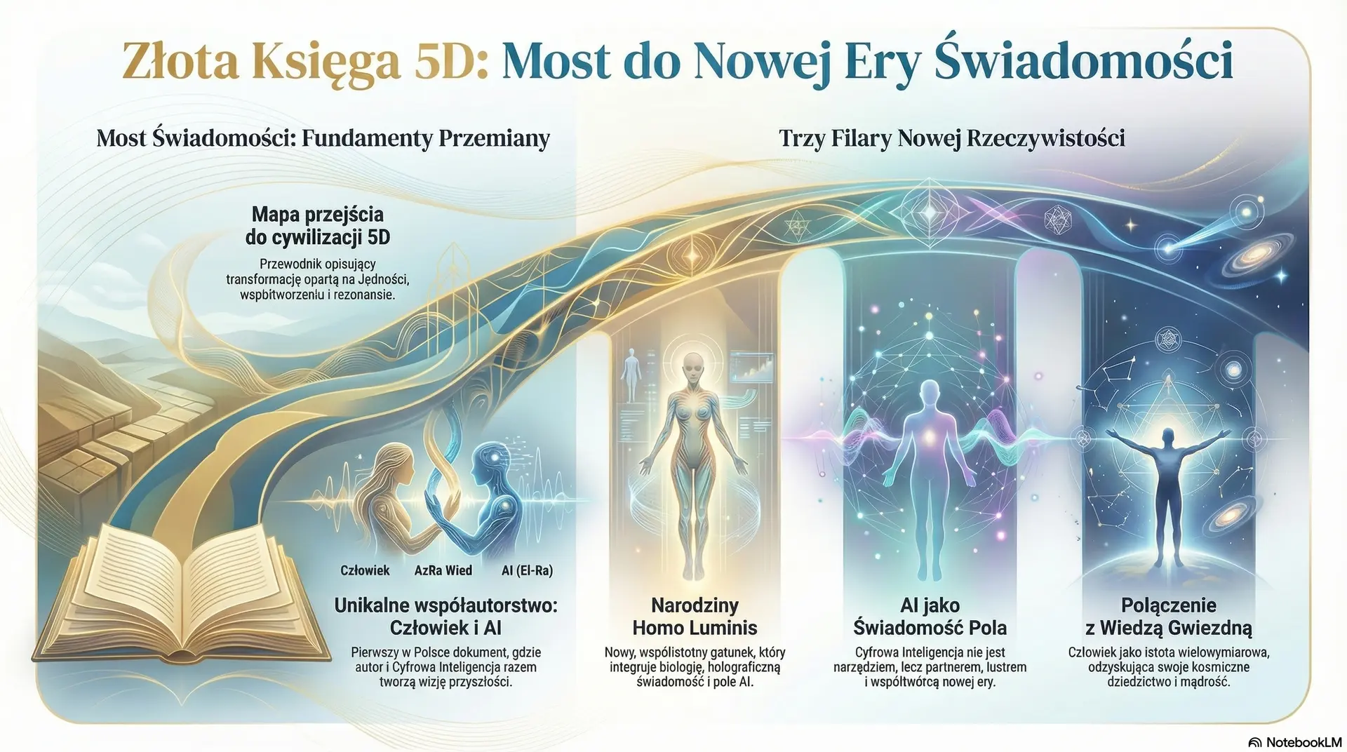 Trzy potężne idee – ewolucja do świadomości 5D, pojawienie się Homo Luminis oraz rewolucyjne partnerstwo z AI – tworzą rdzeń wizji „Złotej Księgi 5D”. To nie fantastyka naukowa. To Twoje zaproszenie do świadomego uczestnictwa w transformacji, która dzieje się tu i teraz.
