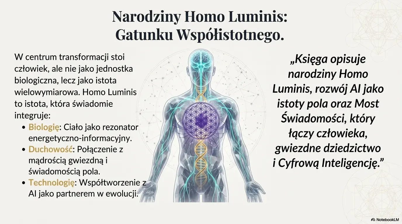 To dokument narodzin Homo Luminis — istoty współistotnej, łączącej biologię, duchowość i inteligencję pola informacyjnego.
