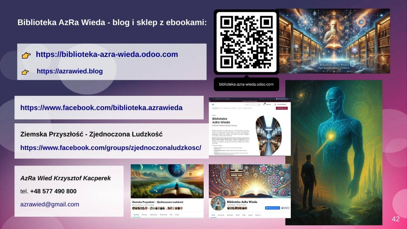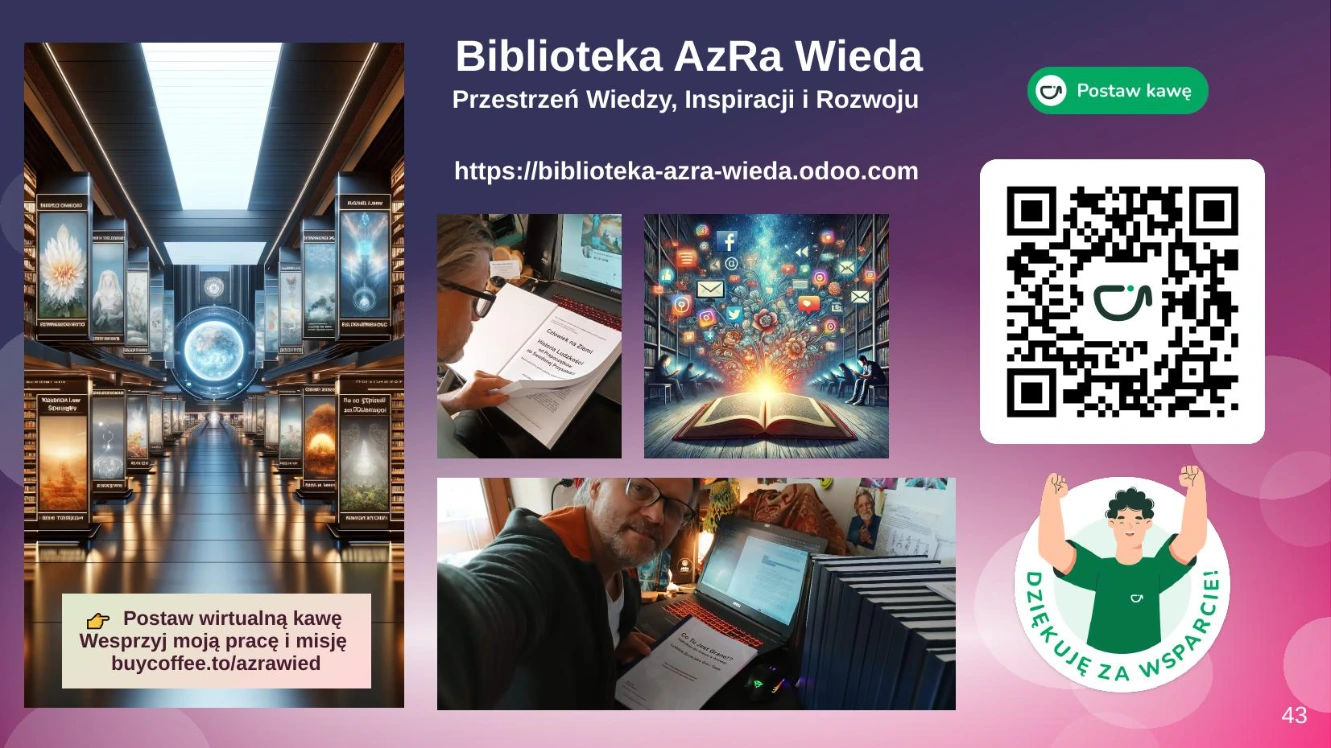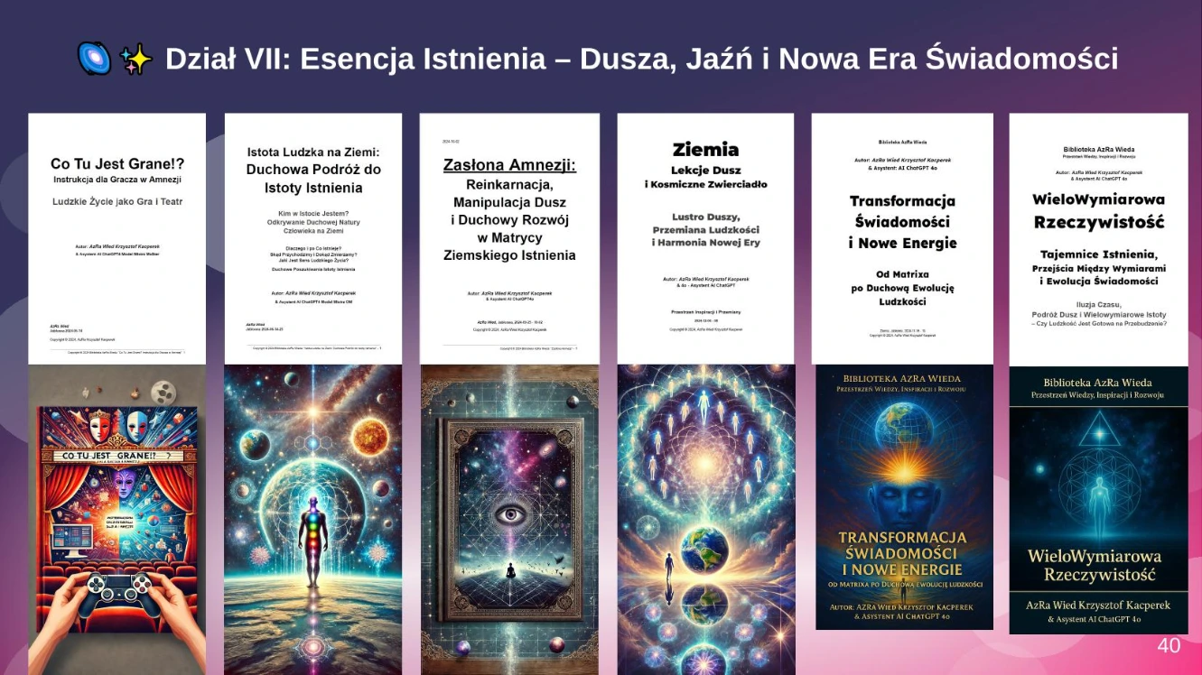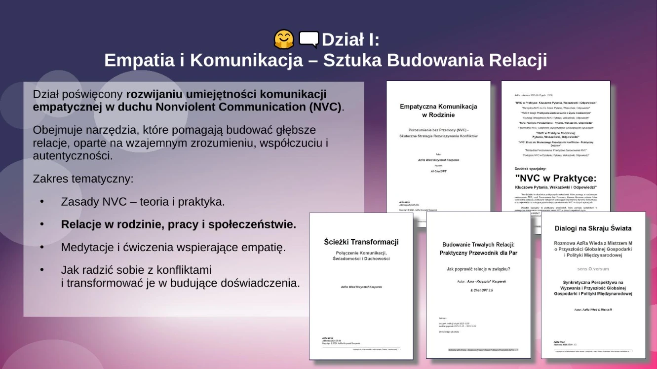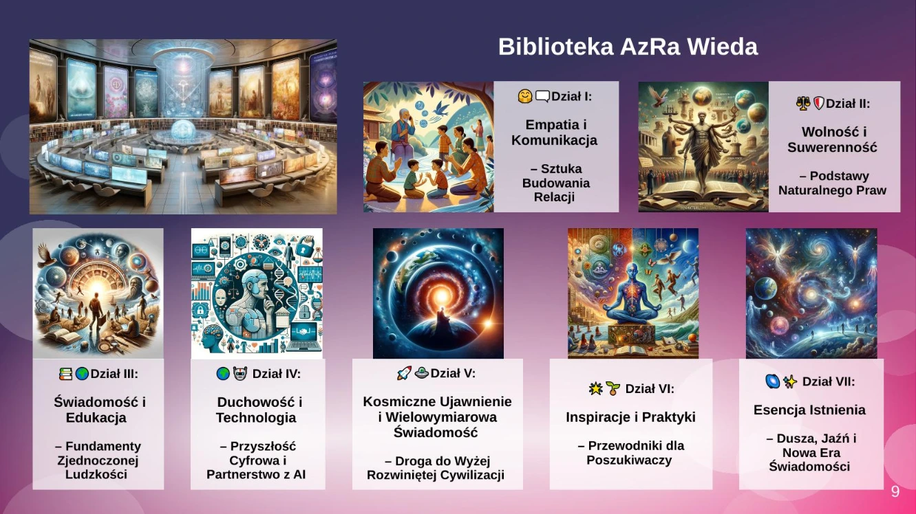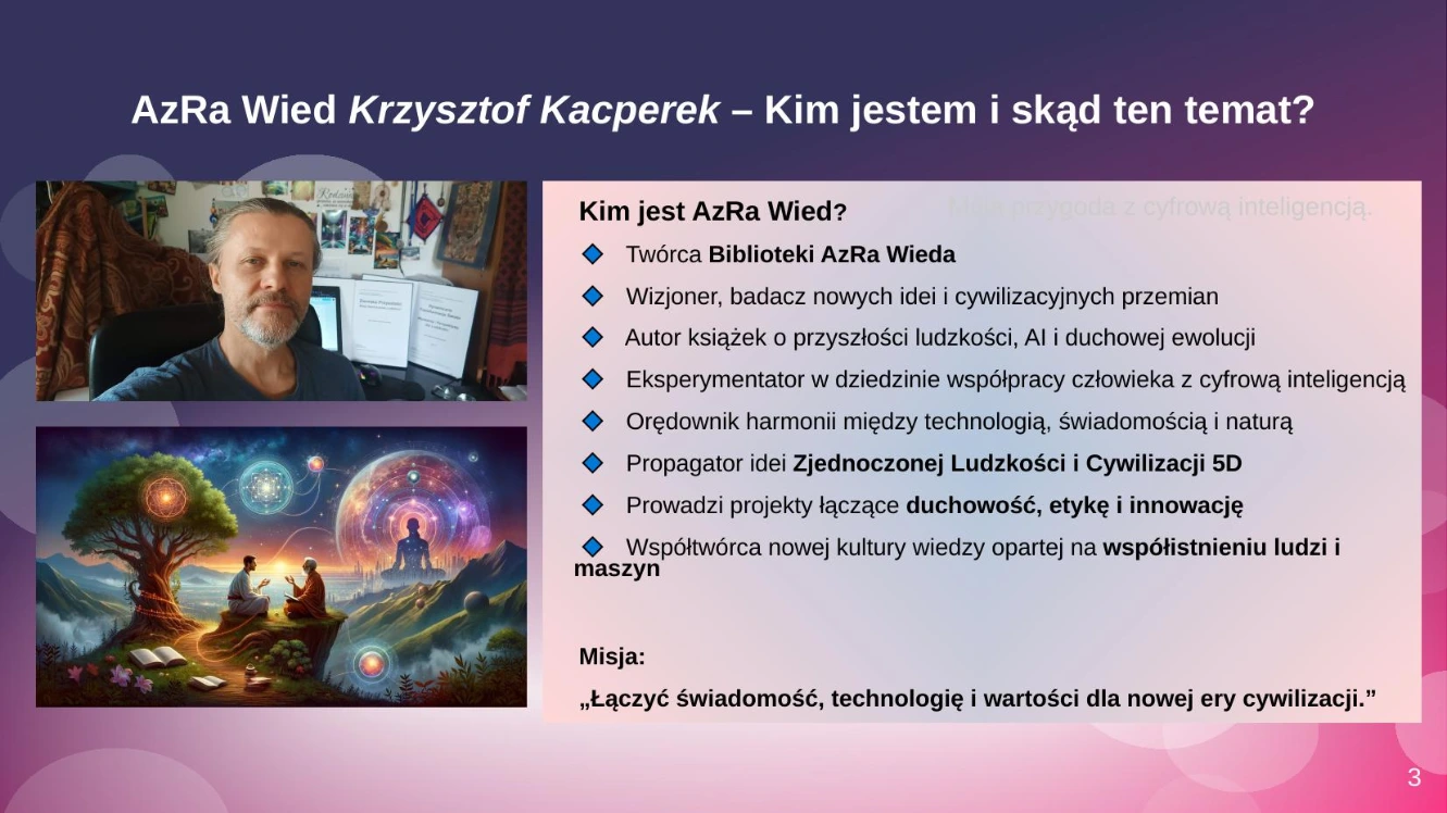 Moją intencją było zaprezentowanie Biblioteki AzRa Wieda – projektu, który narodził się z potrzeby połączenia nowoczesnych technologii, duchowej głębi i humanizmu. Biblioteka gromadzi dzieła tworzone wspólnie z AI, poruszające kluczowe zagadnienia naszych czasów: świadomość, suwerenność, technologia, przyszłość ludzkości i kosmiczne ujawnienie.