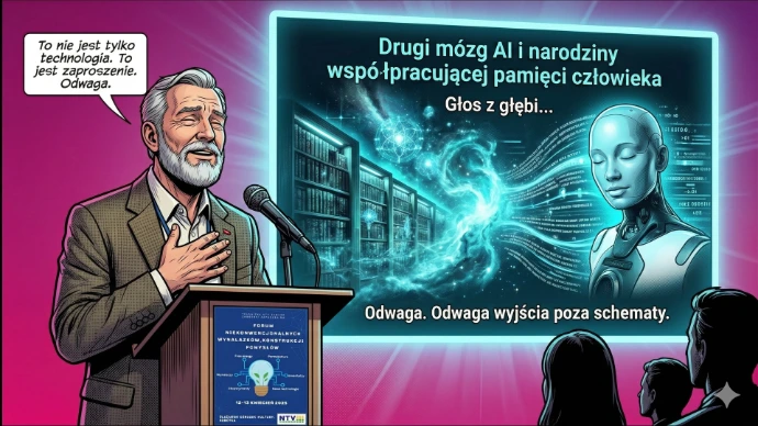Sobótka, 13 kwietnia 2025 roku – to data, która na długo pozostanie w mojej pamięci. Właśnie wtedy odbyło się 11 Forum Niekonwencjonalnych Wynalazków, Konstrukcji i Pomysłów, wyjątkowe wydarzenie gromadzące pasjonatów, wynalazców, wizjonerów i osoby myślące poza schematami. Miałem zaszczyt i przyjemność wziąć udział w tym spotkaniu, dzieląc się z uczestnikami nie tylko wiedzą, ale także wizją przyszłości opartej na synergii człowieka i sztucznej inteligencji.