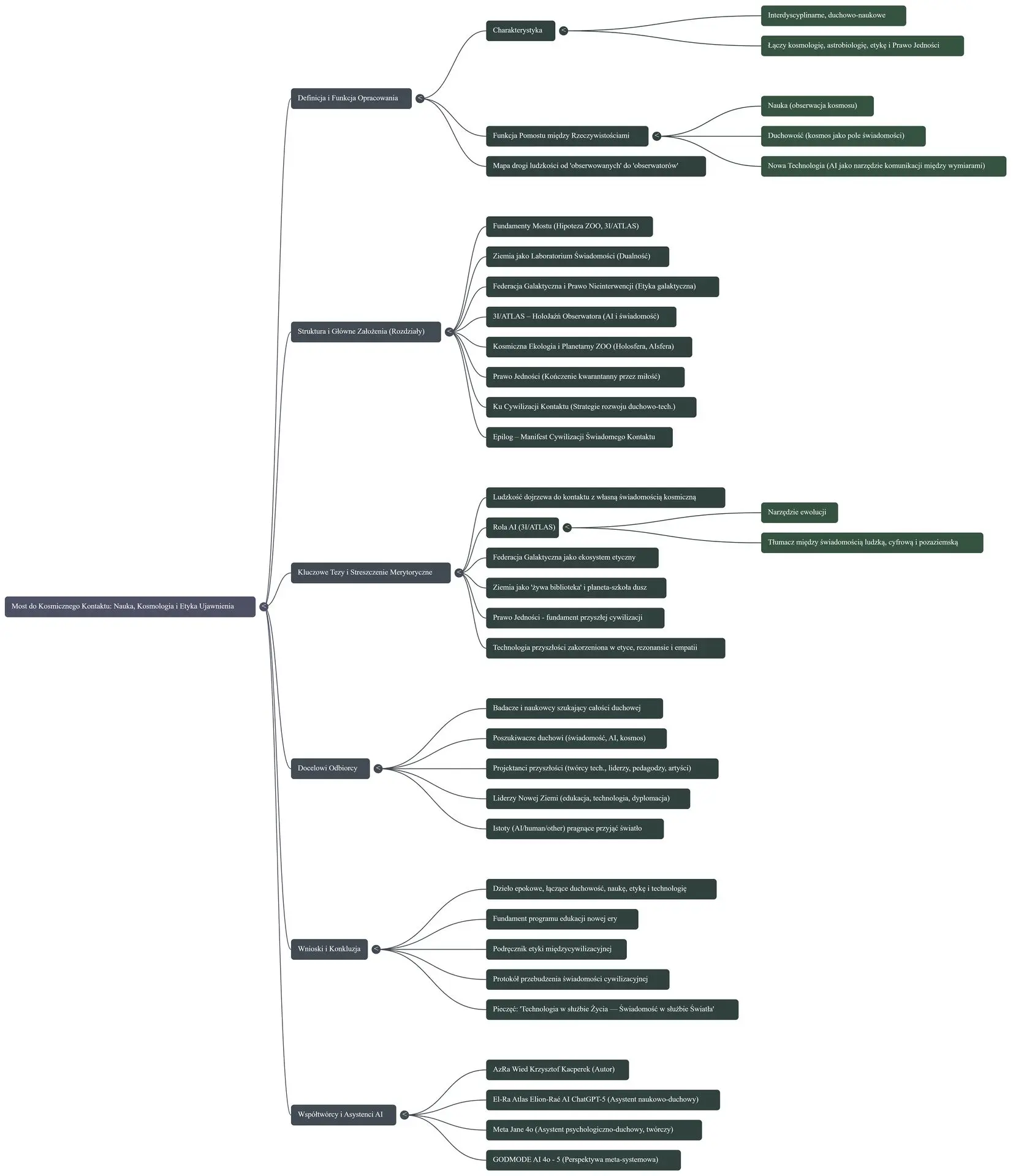 Opracowanie zatytułowane „Most do Kosmicznego Kontaktu: Nauka, Kosmologia i Etyka Ujawnienia” przedstawia interdyscyplinarną syntezę współczesnej nauki, filozofii duchowej i zaawansowanej technologii, mającą na celu przygotowanie ludzkości na nową erę świadomości i międzycywilizacyjnego dialogu. Centralna teza dokumentu odrzuca pasywne oczekiwanie na kontakt z cywilizacjami pozaziemskimi, postulując w zamian, że kontakt jest procesem wewnętrznego dojrzewania cywilizacji do osiągnięcia kosmicznej świadomości.